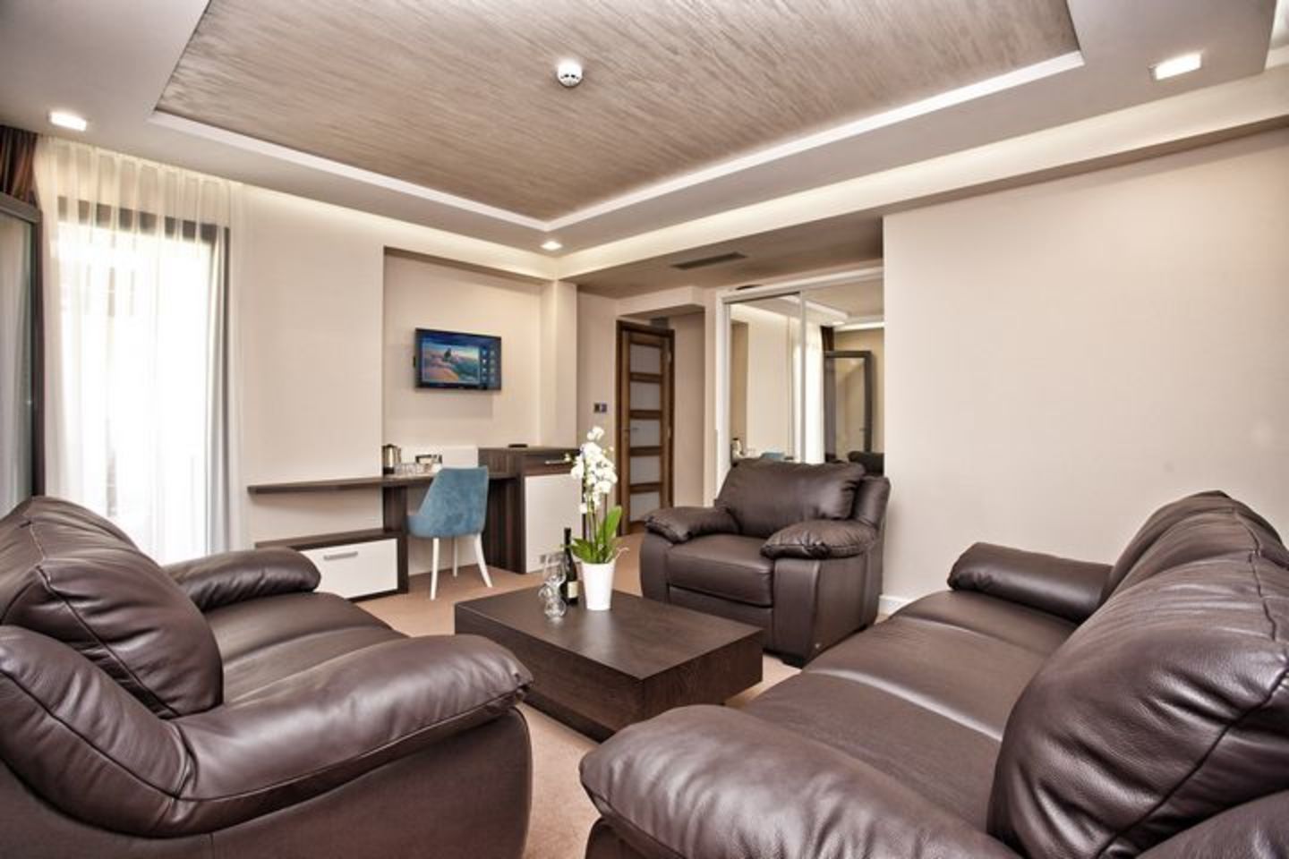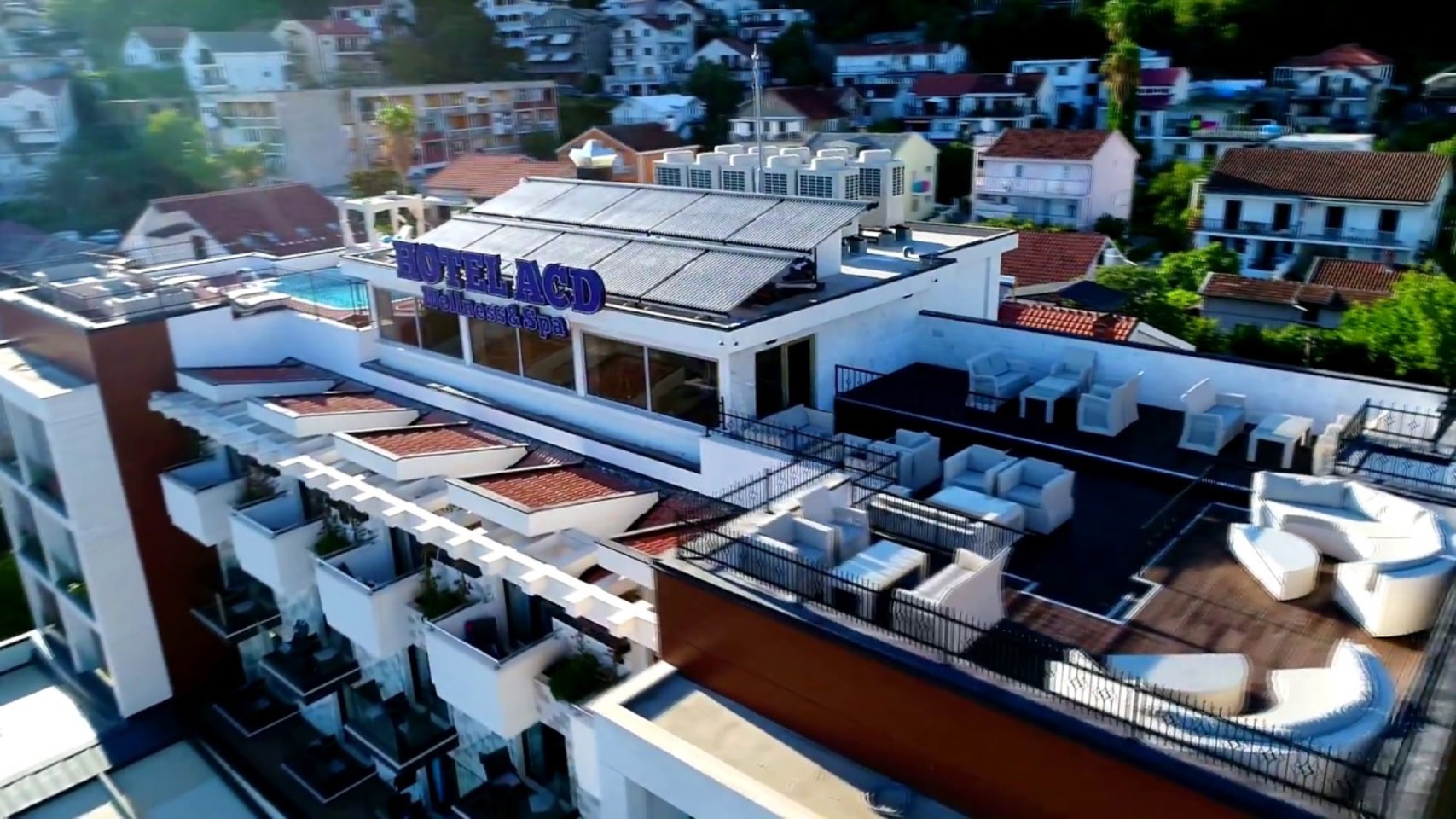roof terrace. The terrace offers a beautiful view of the Bay of Kotor, and the outdoor pool makes it unique. The spa offers a variety of medical and wellness treatments. Free use of various types of sauna, Turkish bath and gym is available for guests. Facilities for meetings and banquets are available as well as a children's playroom.