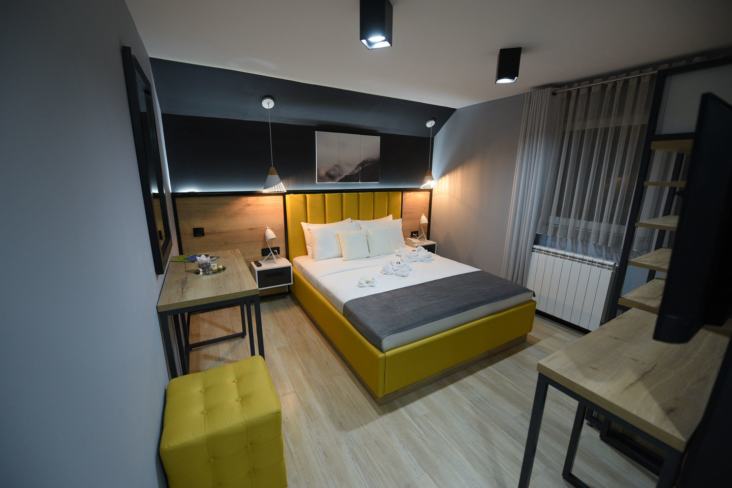 The hotel has 15 luxury accommodation units: – 1 economic twin room – 1 deluxe triple room (queen size bed + bed for single use) – 5 standard double rooms with queen size beds – 5 deluxe double rooms with queen size beds – 1 duplex apartment (2 bedrooms – 2 queen size beds + 2 beds for single use) – 2 duplex apartments (2 bedrooms – 2 queen size beds + 1 bed for single use). The rooms are decorated in a modern style, equipped with a flat-screen TV with satellite channels. A minibar and coffee and tea making facilities are available in the rooms.