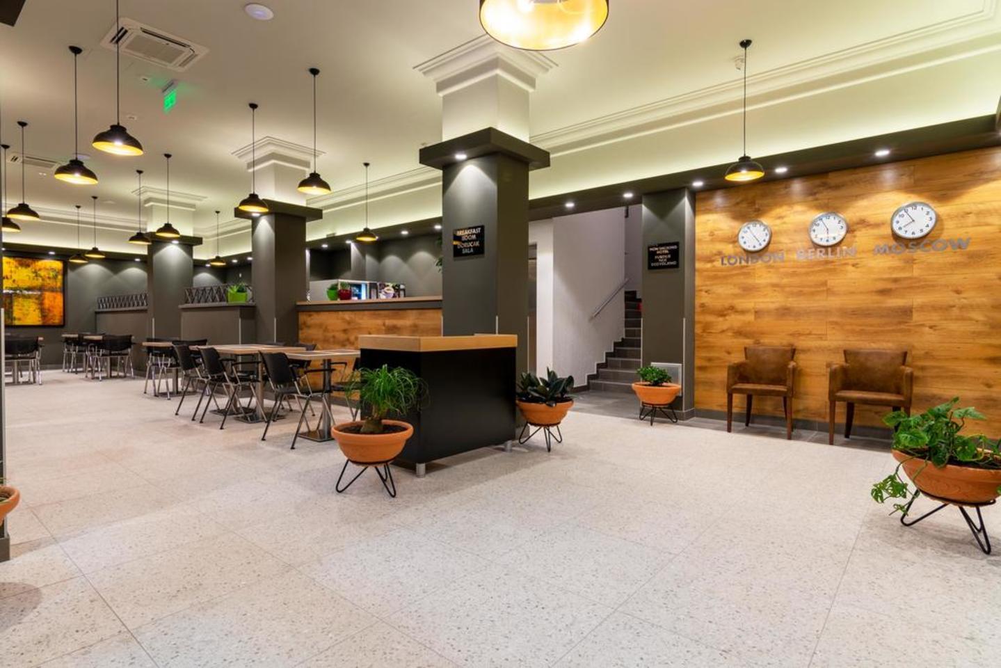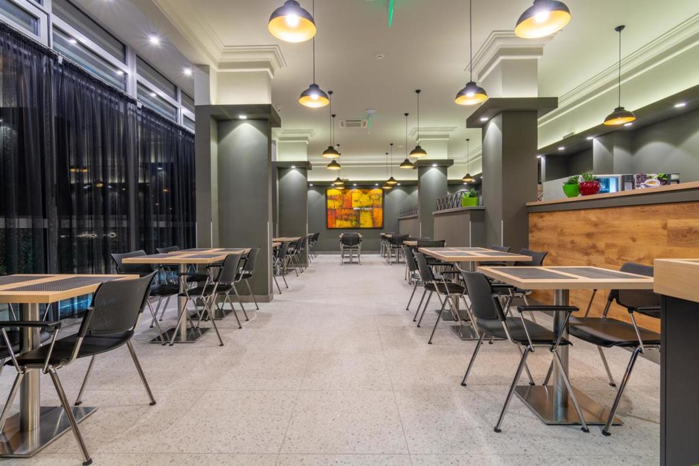 The breakfast room will provide you with the necessary sense of silence, space and rest. At tables set up for two or four people, you can sit alone or with your family and enjoy your breakfast, in a pleasant atmosphere and a beautiful view of the boulevard in front.